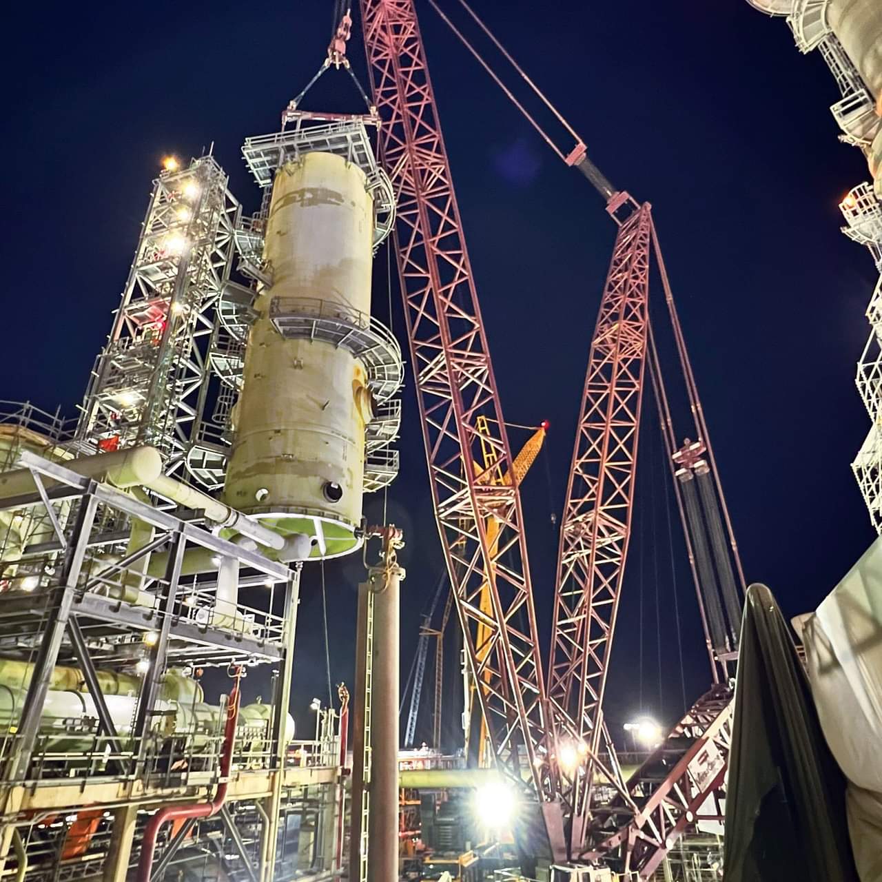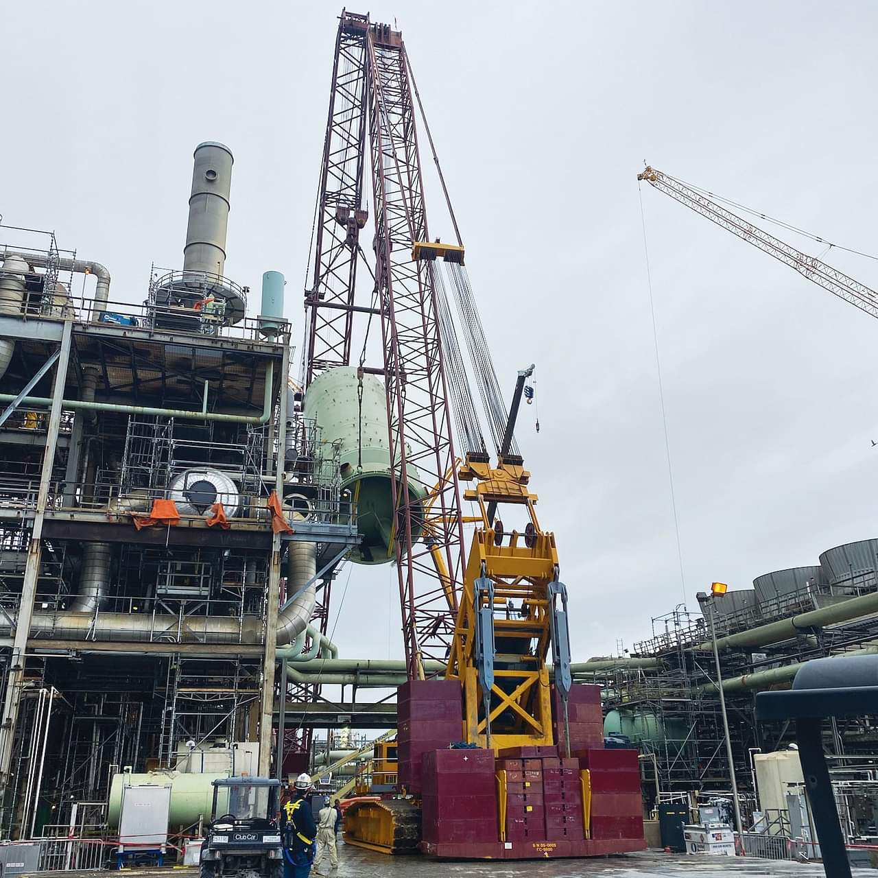 Once ready for placement, the acid settler was lifted and tailed up over a pipe rack with an 1,800-ton VersaCrane™ TC-28000 in configuration 4/8 (273' boom, 400 kips main cwt, 1,080 kips aux. cwt) with a 750-ton VersaCrane™ CC-9600 in configuration 6 (200' boom, 406 kips main cwt, 508 kips hinge cwt. The acid coolers were lifted using a 1,500-ton VersaCrane™ TC-24000 in configuration 5 and placed under a difficult-to-access platform with a Deep South-designed cantilever beam system (instead of a traditional jack-and-slide), which cut the lift and set time in half.
