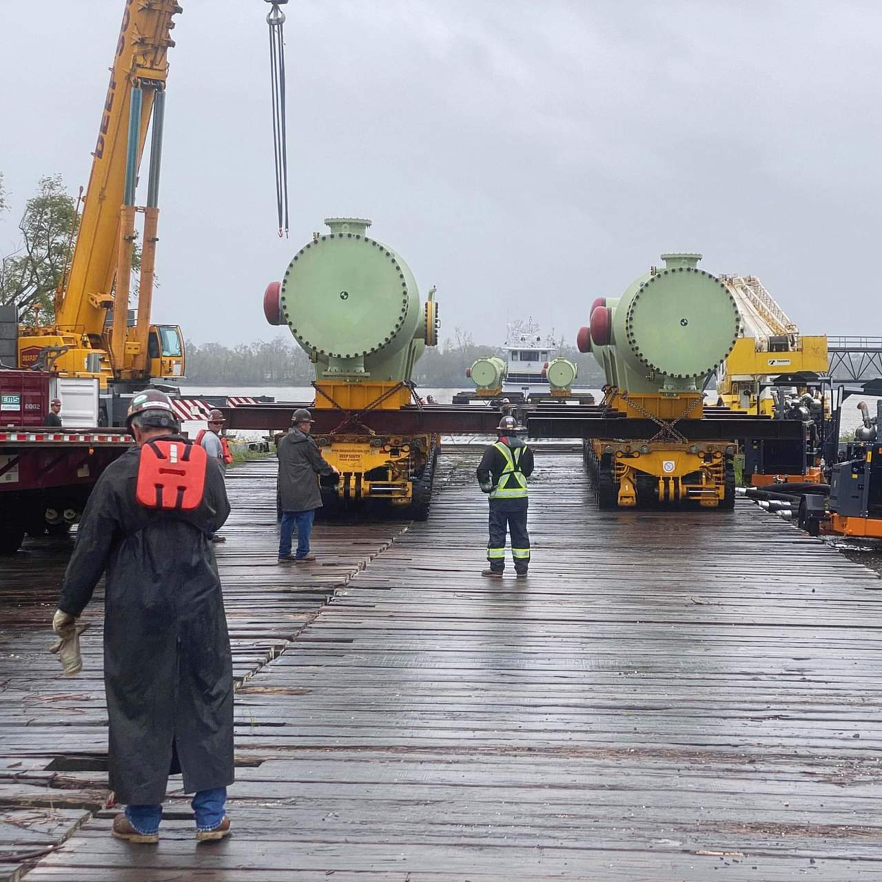 Deep South received the acid coolers, acid settler and piping components from an ocean-going vessel at the Port of New Orleans. The vessels were lifted onto a waiting barge and then hauled to the client’s established roll-off site. The acid settler was then rolled off the barge to an 18-axle-line, double-wide Scheuerle SPMT for transport to the site. Once onsite, the settler was moved to a 12-axle-line Scheuerle “Split” SPMT-SL with a single wide 6-line SPMT following for power pack support due to limited clearances from overhead structures. The acid coolers were moved with a 12-axle-line Scheuerle SPMT.