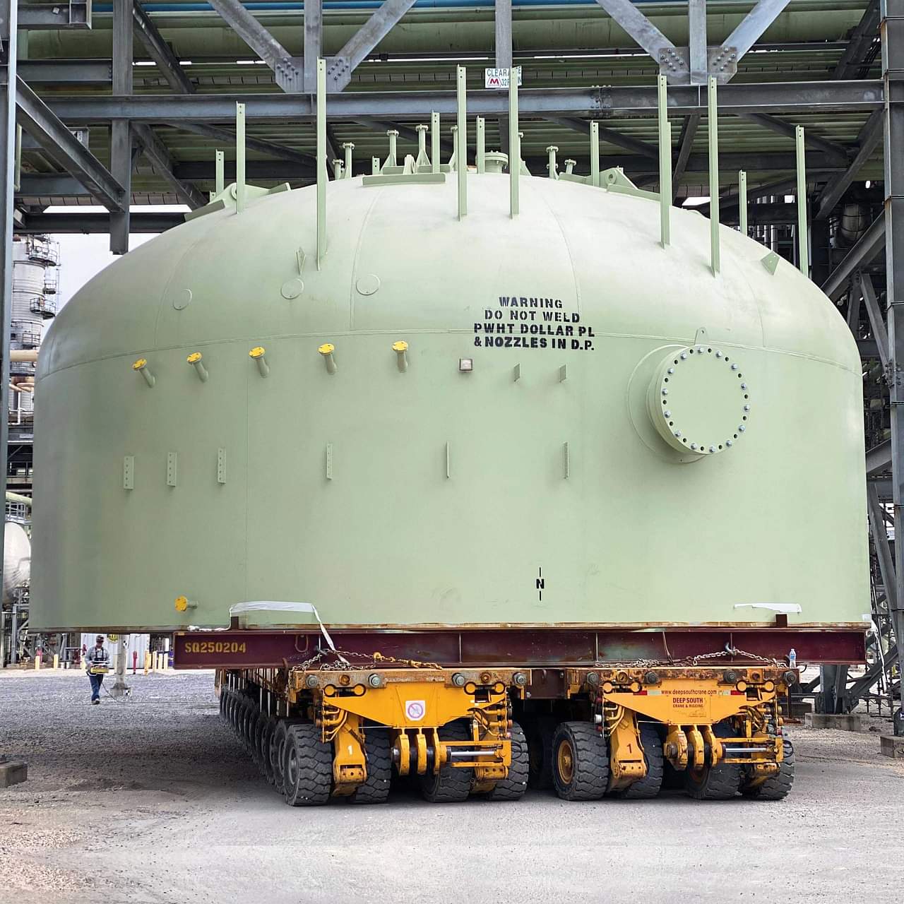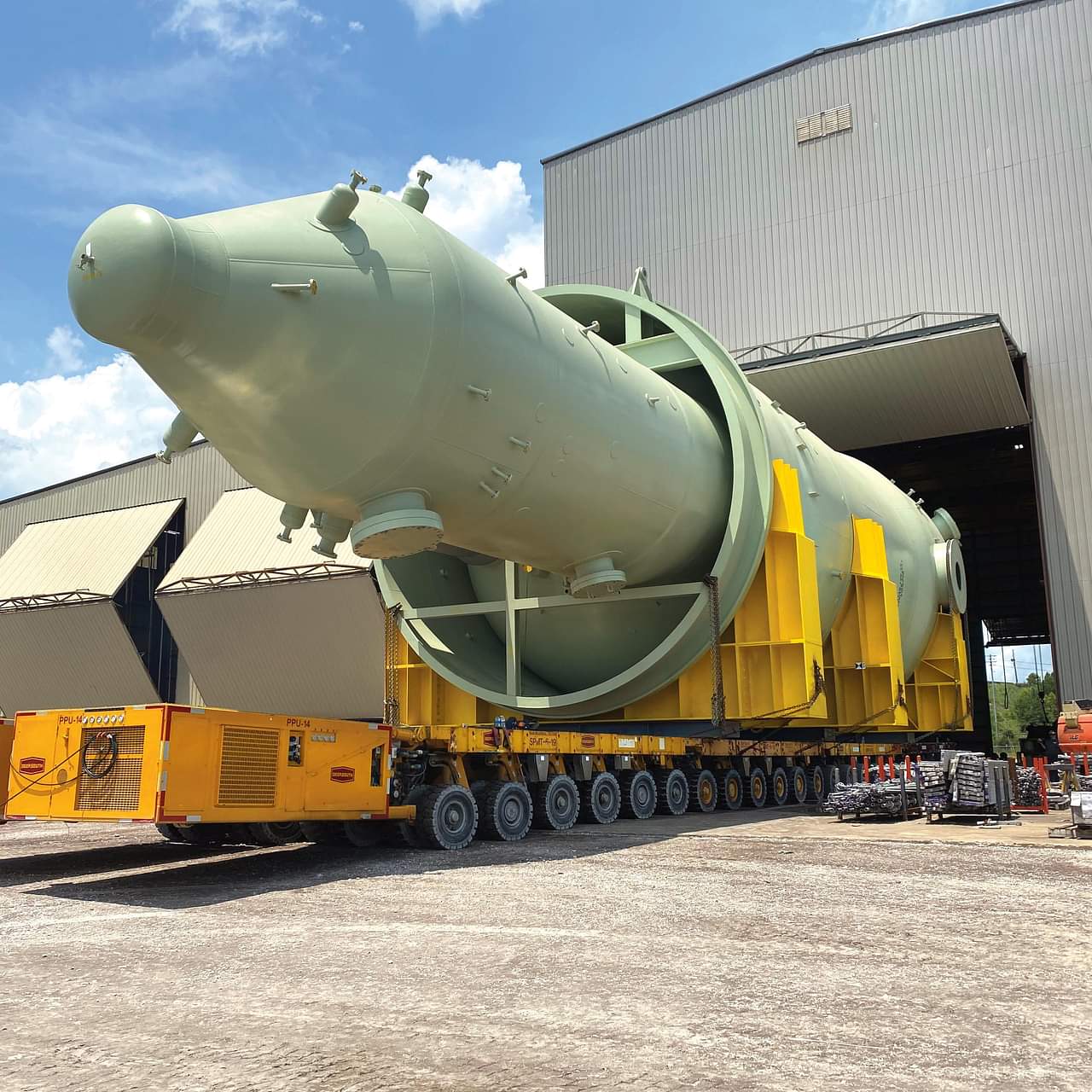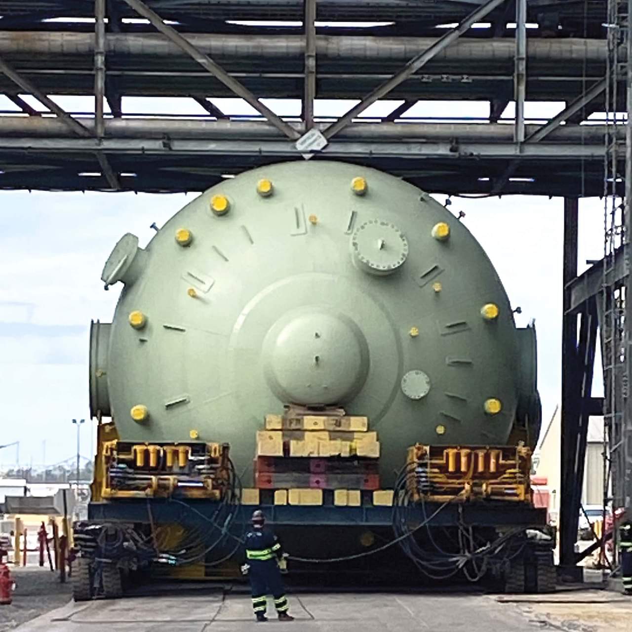 The regen head was transported using a 12-axle-line Scheuerle SPMT and lifted with the same equipment. The total regen head assembly was 875,000 pounds. For the lift, Deep South designed and built a custom octagon bar to fit the vertical pull requirements of the regen’s eight lifting lugs. Further, as the center of gravity for the reactor was offset, the team designed an adaptable system of links that could be easily adjusted a few shifts before the lift.