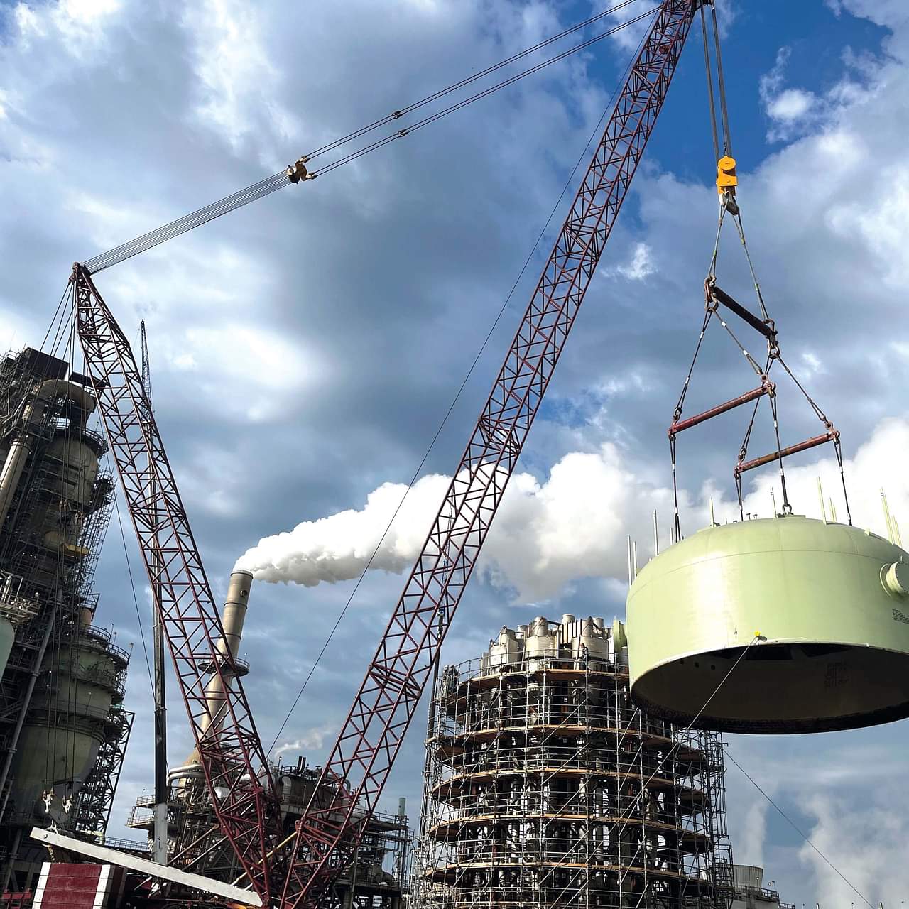 Once onsite, the large reactor was placed onto 22-axle-line Scheuerle “Split” SPMT-SL trailers to accommodate limited clearances on the heavy haul route. A 2,500-ton VersaCrane™ TC-36000/S1 in configuration 7 and a 750-ton VersaCrane™ CC-9600 in configuration 6 were then used for the lift.