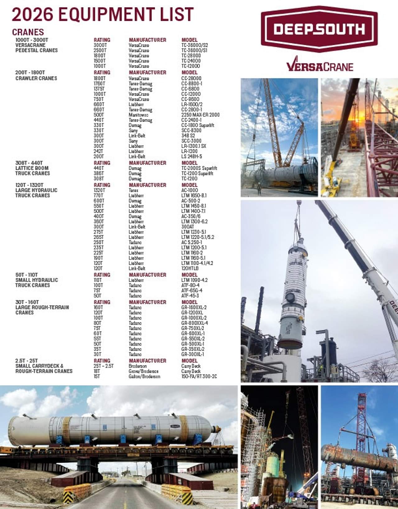 Deep South Crane & Rigging performed turnkey transport and lift services for a Southeast oil refinery, transporting a 500,000-pound deisobutanizer from its fabricator in Vicksburg, Mississippi to Krotz Springs, Louisiana using a combination of over-the-road hauling, barging, and heavy lifting. The 1,500-ton VersaCrane TC-24000 as well as the 440-ton Demag CC-2400 lifted it into final position. Lifting bails with all steel-plate links allowed the crane operator to unhook the rigging without any personnel having to access the top of the tower.